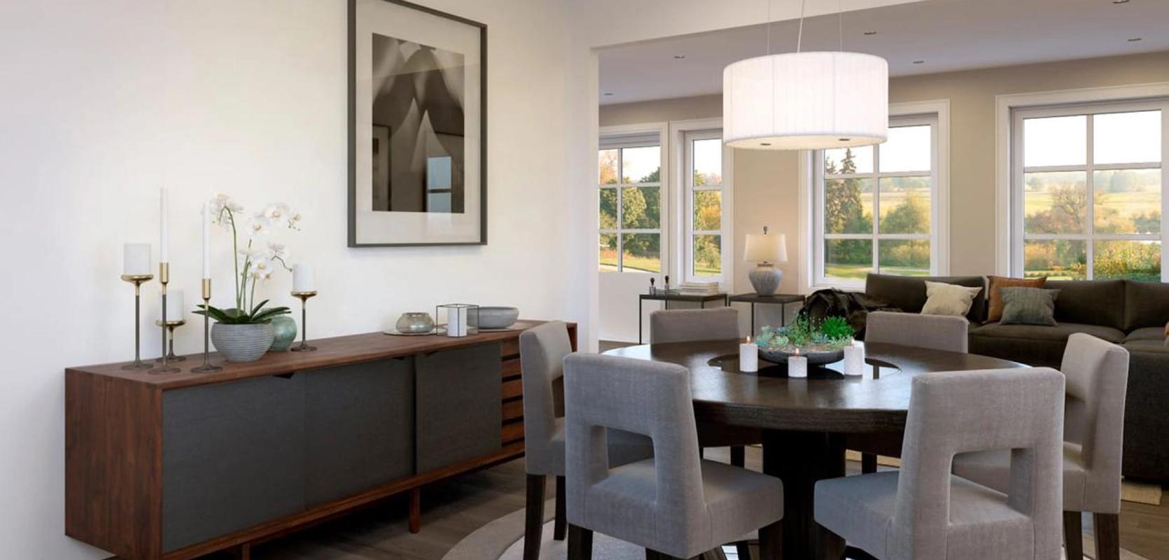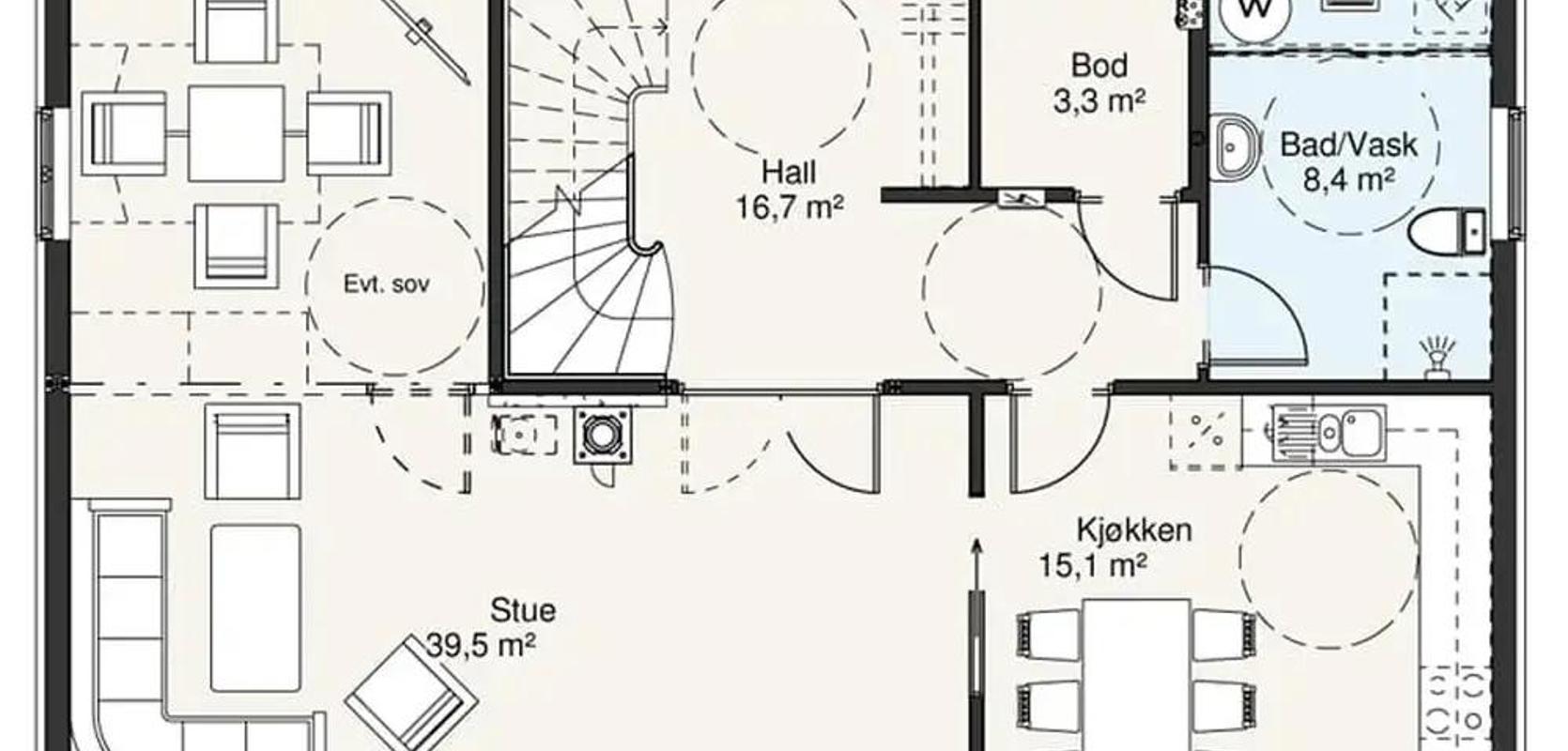 I dag er det blitt svært vanlig med åpne kjøkken- og stue-løsninger, men det er ikke alltid det er like praktisk. Her er det skyvedør mellom stua og kjøkkenet, slik at man kan ha det åpent mellom rommene, men man kan også stenge av ved behov. Hvis man har behov for flere stille steder til hjemmekontor, kan for eksempel kjøkkenbordet benyttes. Eller motsatt, hvis et av barna gjør lekser i stua, og de andre lager pizzadeig med kjøkkenmaskin på kjøkkenet, så kan man stenge ute bråket. Man kan også lukke bort alt rot på kjøkkenet, og sette seg i stua med gjester. Fra gangen er det er også en egen dør inn til kjøkkenet, slik at det er kort vei å bære matvarene.